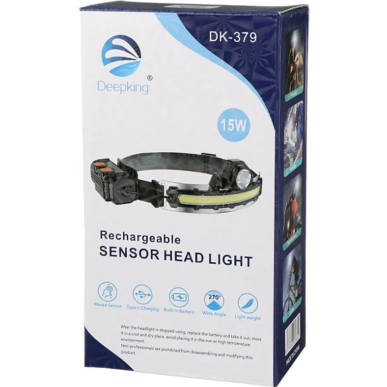 چراغ پیشانی شارژی سنسوردار ۱۵ وات Deepking DK‑379 ضدآب مناسب کوهنوردی، کمپینگ و کار صنعتی