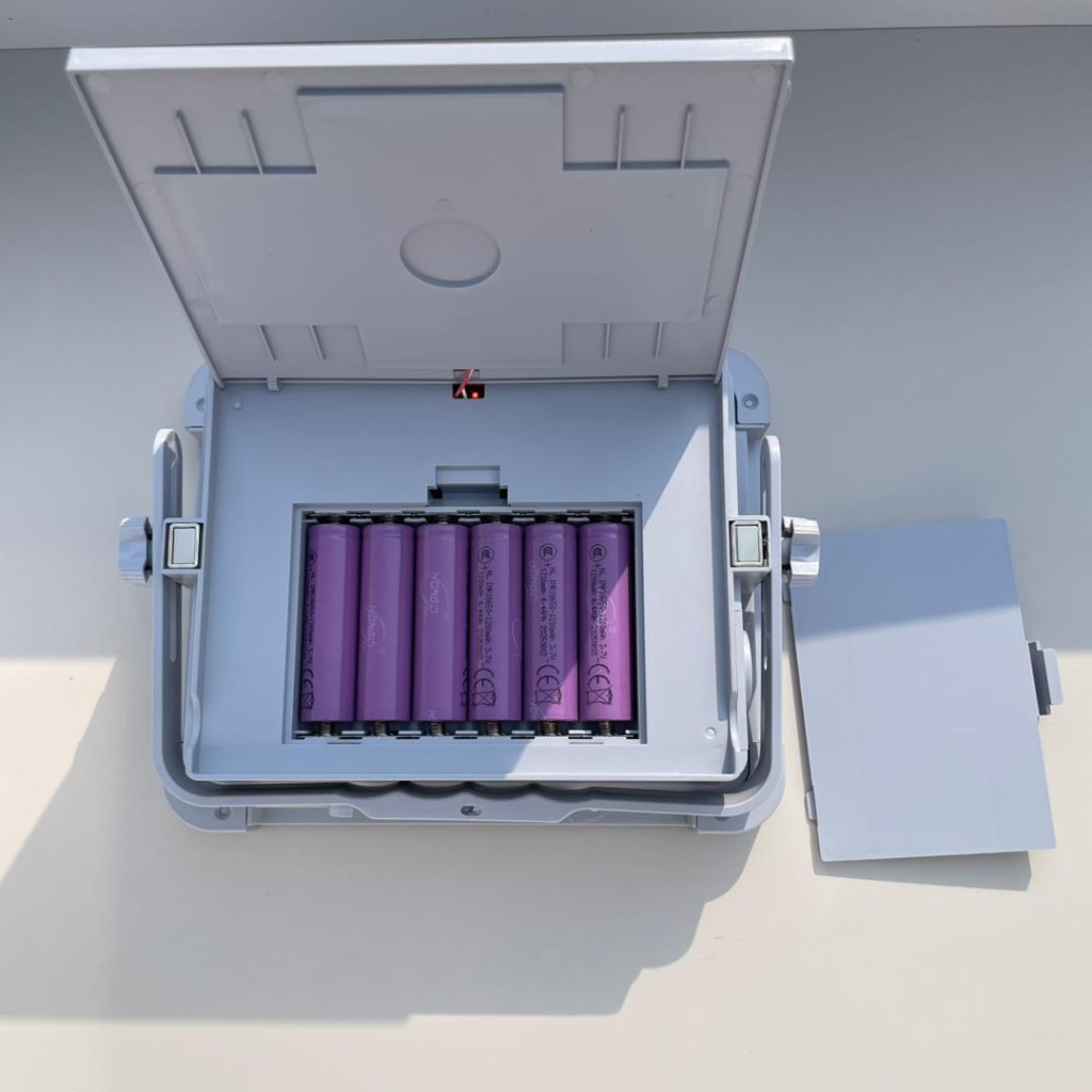 این مدل از ۶ باتری لیتیومی 18650 بنفش و قابل تعویض استفاده میکند؛ باتریهایی با ظرفیت بالا و وزن واقعی 45 تا 50 گرم. مجموع ظرفیت حدود 18000 میلیآمپر ساعت است؛ یعنی ساعتها نوردهی پایدار. درپوش ضدآب باتریها از نفوذ باران جلوگیری کرده و عمر دستگاه را افزایش میدهد.