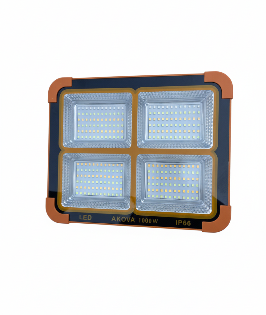 پروژکتور خورشیدی AKOVA 1000W یک منبع نوری قدرتمند و قابل حمل است که با طراحی مقاوم و پنل خورشیدی داخلی، روشنایی مطمئن را برای شما فراهم میکند. بدنه ضدآب با استاندارد IP66، این محصول را برای استفاده در شرایط جوی مختلف مانند باران و رطوبت، ایدهآل ساخته است. قابل شارژ با برق خانگی و سایر روش های شارژ از جمله آداپتور موبایل و فندکی خودرو و پاوربانک
