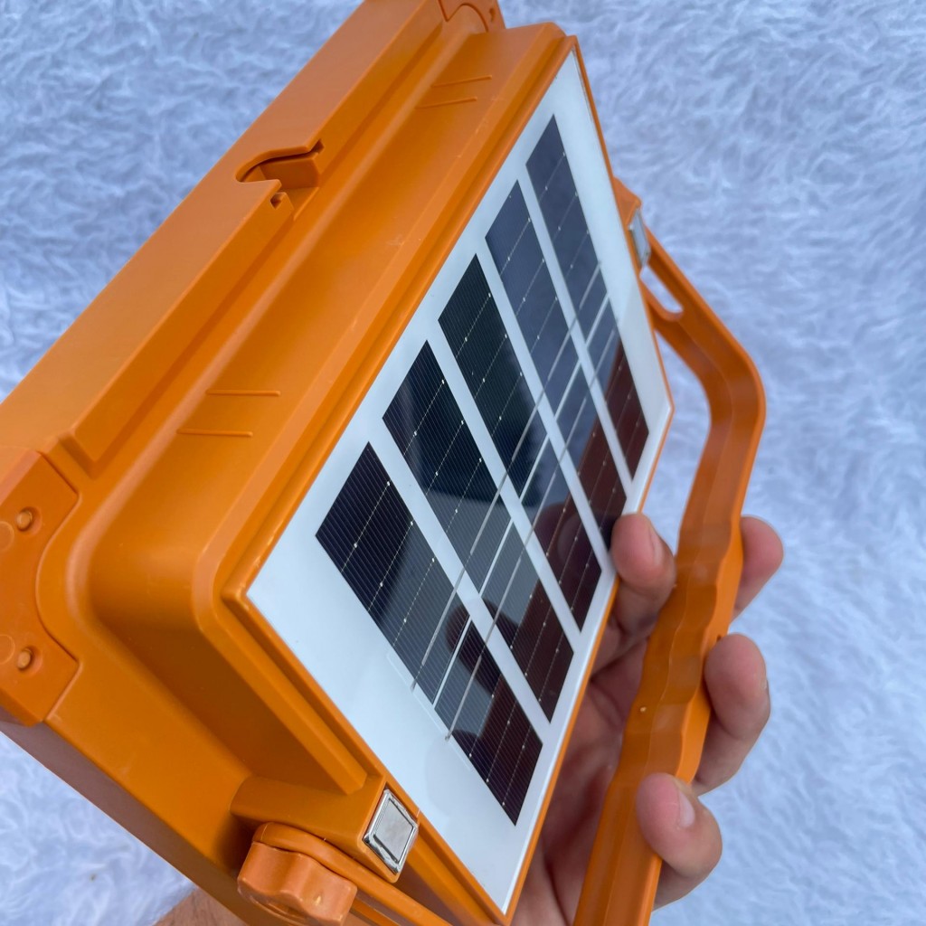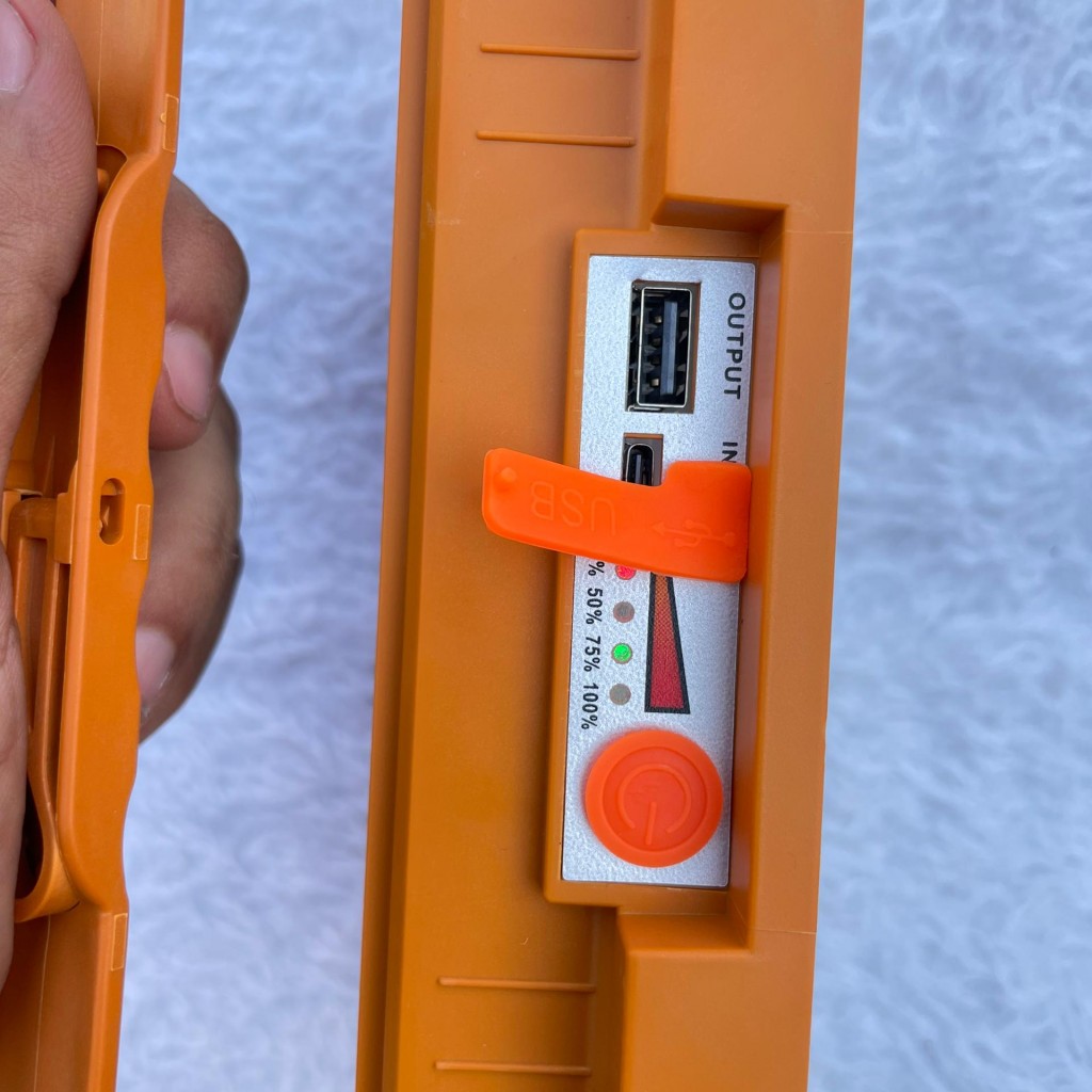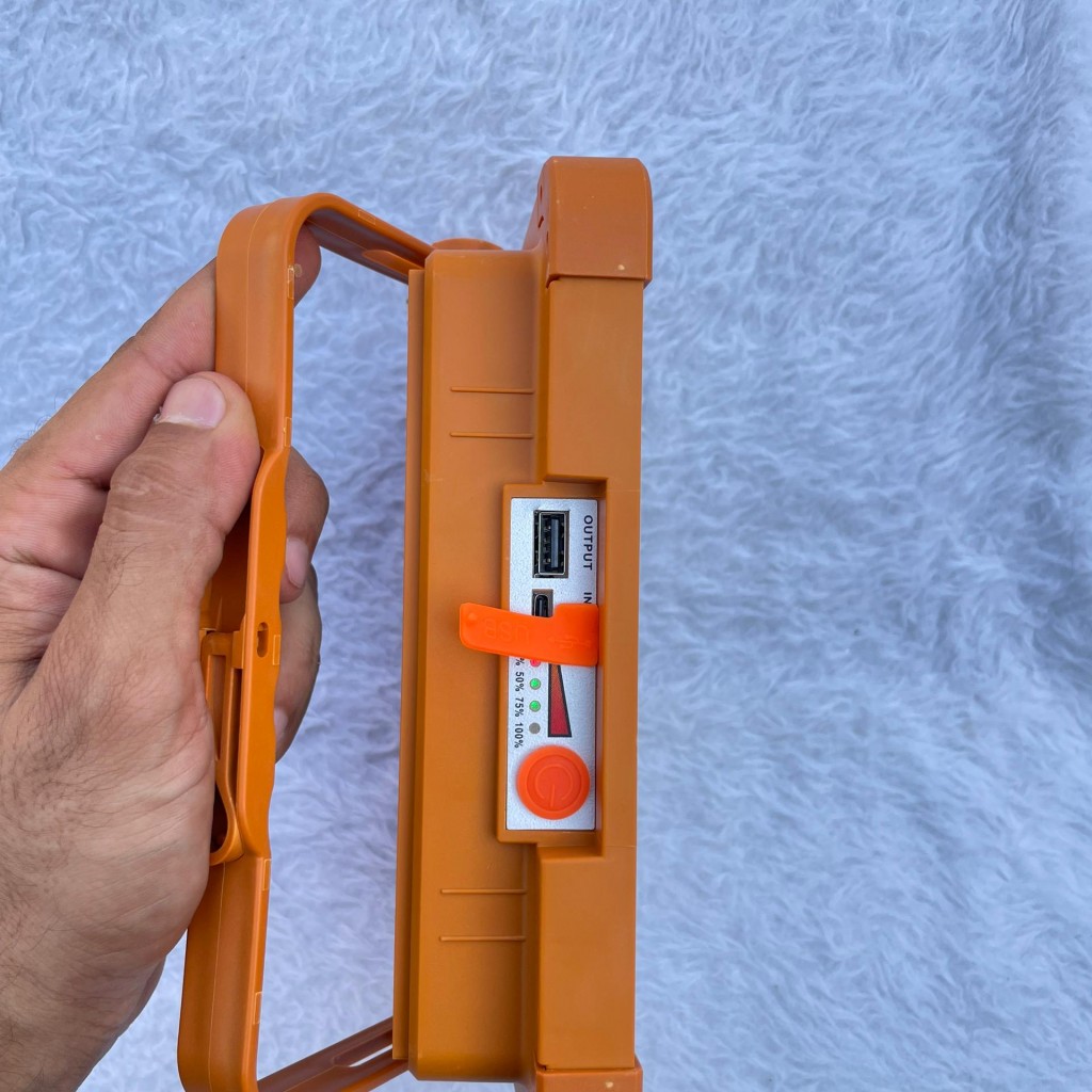 توان1000 وات (اسمی)نوع روشناییLED پرقدرت منبع تغذیه پنل خورشیدی داخلی + امکان شارژ با برق شهری باتری /باتری داخلی قابل شارژ شدت نوربالا با پراکندگی یکنواخت ضدآب استاندارد IP66 (مقاوم در برابر باران و رطوبت)پورت USB خروجی دارد (برای شارژ موبایل و دستگاههای کوچک)کاربردهافضای باز، باغ، حیاط، سفر، کمپینگ، کاربرد اضطراریاقلام همراه کابل شارژ، راهنما، دسته قابل حمل رنگ بدنه نارنجی.