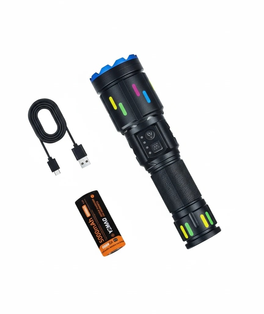 بدنهی فلزی مشکی با تزئینات رنگی نئونی، باتری قدرتمند ۵۰۰۰ میلیآمپرساعت و شارژ سریع Type‑C، این چراغ را به گزینهای عالی برای کمپینگ، نگهبانی، تعمیرات شبانه، مأموریتهای امنیتی و سفرهای طبیعتگردی بدل کرده است.