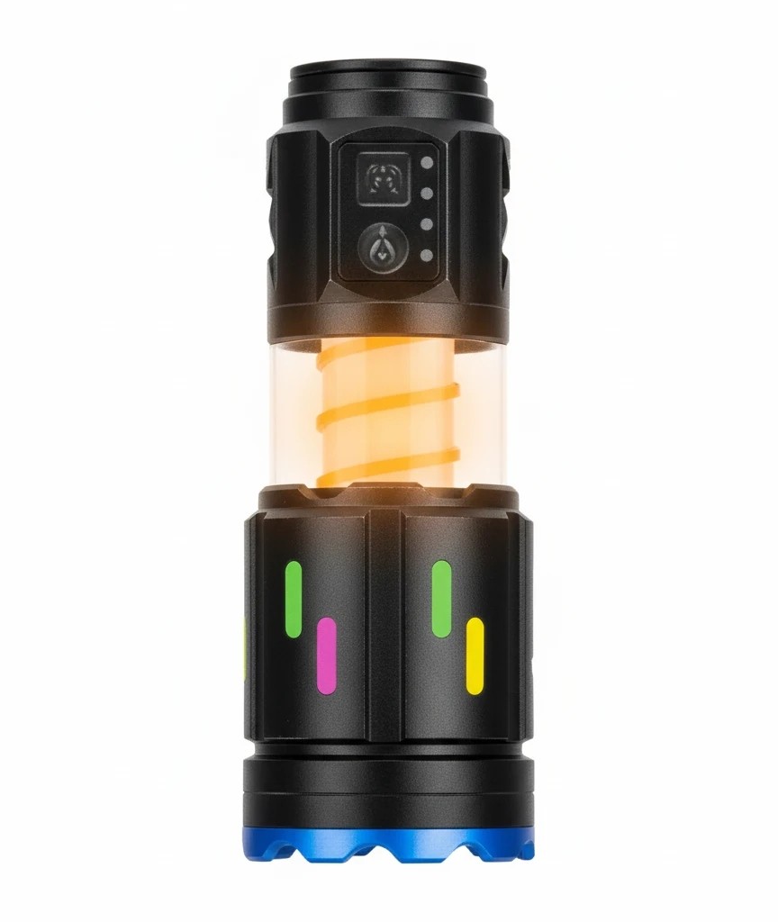 در بخش مرکزی بدنه، محفظهی شیشهای شفاف قرار گرفته که نور زرد مارپیچی داخلی از آن تابیده میشود و علاوه بر جلوهی زیبا، روشنایی محیطی ملایمی ایجاد میکند — مثلاً داخل چادر، خودرو یا فضای نگهبانی.
